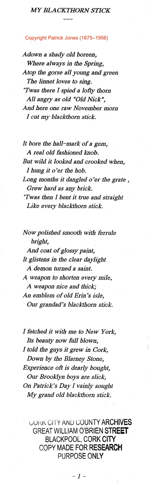 “My Blackthorn Stick” is part of a 50-poem collection by Patrick Jones (Cork City & County Archives ref. SM772). The foreword of the collection claims that the bulk of the poems were written between 1920 and 1940, although it seems that they were not compiled and typeset by his family until after Jones’ death. Thanks to Steven Skeldon of the Cork City & County Archives, Jim Fahy of the Cork Masons Historical Society, and the Jones family for their assistance and support.